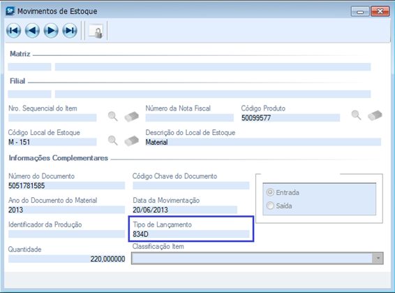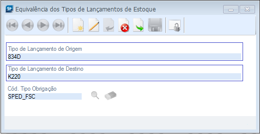 O registro K220 será apresentado quando houver informações na tela 'Movimentos de Estoque' com tipo de lançamentos específicos, configurados na tela 'Equivalência dos Tipos de Lançamentos', conforme exemplo a seguir: