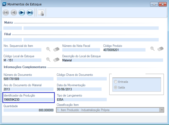 Para a geração do registro K230 serão considerados os lançamentos da tela 'Movimentação de Estoque', classificados como '1 - Item Produzido - Industrialização Própria'.