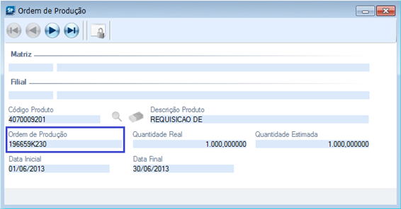 Para apresentação dos campos "02 - DT_INI_OP", "03 - "DT_FIN_OP" e "04 - COD_DOC_OP" serão considerados os lançamentos da tela 'Ordem de Produção'. O relacionamento entre as telas 'Movimentos de Estoque' e 'Ordem de Produção' será efetuado através dos campos 'Identificador da Produção' e 'Ordem de Produção'.