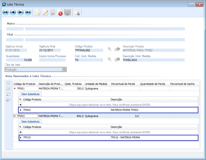 Considerando este exemplo, no campo "03 - COD_ITEM" será demonstrado o código do item que de fato foi utilizado na produção (TP002 e TP015). Enquanto que, no campo "05 - COD_INS_SUBST" será apresentado o código do item que foi substituído (TP001 e TP003).